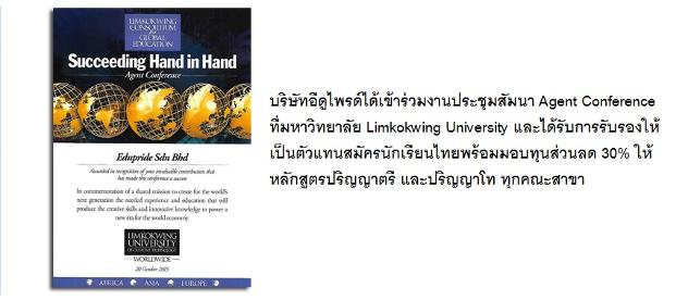 บริษัท Edupride โฉมใหม่ภายใต้การบริหารของ Edupride Group เราได้ปรับปรุงเพื่อให้บริการให้ดียิ่งขึ้นและให้คำปรึกษาแนะแนวการศึกษาต่อประเทศมาเลเซียโดยมีจุดมุ่งหมายเพื่อให้การบริการอย่างครอบคลุมและมีมาตรฐานเพื่อให้การศึกษาต่อเป็นไปอย่างมีประสิทธิภาพและสะดวกสบายมากยิ่งขึ้น ด้วยทีมงานที่มีประสบการณ์ความเชี่ยวชาญในการศึกษาต่อที่ประเทศมาเลเซียจริงโดยมีความพร้อมการให้บริการที่เพียบพร้อมด้วยข้อมูลและคุณภาพ เพื่อให้คำปรึกษาและแนะแนวการศึกษาต่อต่างประเทศอย่างเป็นระบบ ด้วยข้อมูลที่ถูกต้องและวิธีการที่เหมาะสม มีความเชี่ยวชาญด้านการศึกษาต่อในประเทศมาเลเซีย เรามั่นใจว่าการให้คำปรึกษาและแนะแนวอย่างมีระบบของเราจะช่วยให้สามารถแนะนำและแนะแนวนักเรียนทุกคนให้เลือกเรียนในสถาบันที่เหมาะสมกับนักเรียนได้ดีที่สุดในทุกระดับตามความต้องการและงบประมาณของนักเรียนแต่ละคน